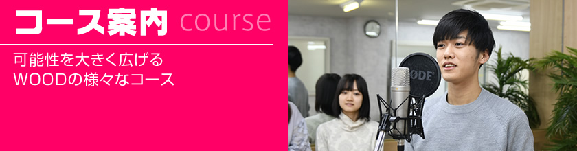 社会人・学生の方がしっかりと声優を目指せるコースです。カリキュラムは声優レッスンだけでなく、シナリオ・ヴォーカルとWOOD PRO ART GROUPの総力をあげた、他の声優養成所や声優教室では学べない内容です。